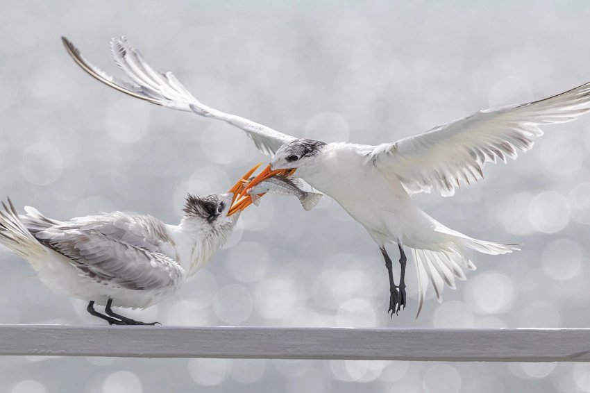 Η αποτύπωση αυτής της εικόνας απαίτησε υπομονή, προσοχή στη λεπτομέρεια και, πάνω απ’ όλα, αντοχή στην έντονη ζέστη του ήλιου. Ο ενήλικος βασιλικός γλάρος (Royal Tern) πετούσε αδιάκοπα, αναζητώντας ψάρια για να ταΐσει το μικρό του, το οποίο περίμενε υπομονετικά πάνω σε ένα κιγκλίδωμα. Πολλοί άνθρωποι πιστεύουν ότι η αφοσίωση και η στοργή προς τα μικρά μας είναι αποκλειστικά ανθρώπινο χαρακτηριστικό, αλλά η φύση, όπως συνήθως, μας αποδεικνύει το αντίθετο. Νιώθω βαθύ σεβασμό για την προσπάθεια αυτών των πουλιών: Το να φωτογραφίσω αυτή τη στιγμή ήταν ένα προνόμιο που άξιζε κάθε δευτερόλεπτο και κάθε σταγόνα ιδρώτα.