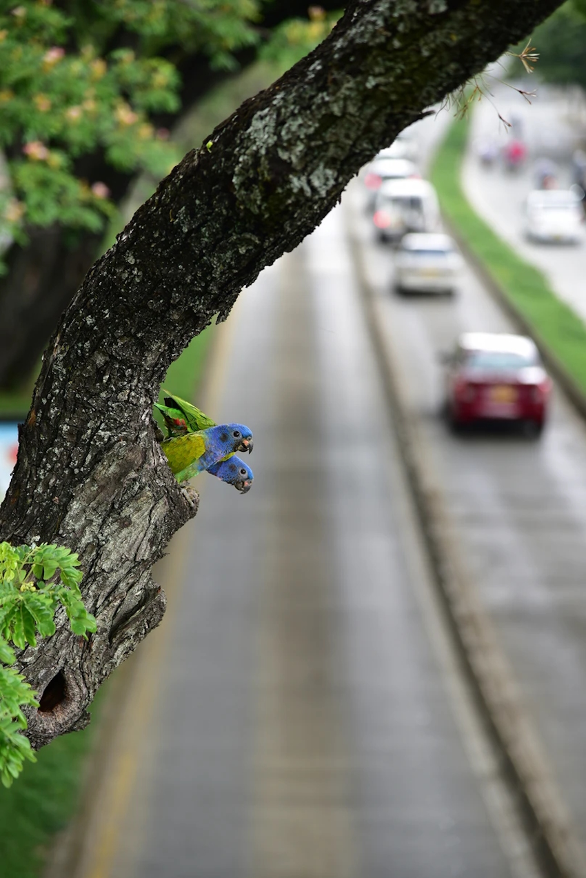 Εκείνη την ημέρα κατέγραφα δέντρα πάνω από έναν ποδηλατόδρομο δίπλα σε έναν πολυσύχναστο δρόμο και ανέβηκα σε μια πεζογέφυρα για να αποκτήσω διαφορετική οπτική γωνία. Τότε ήταν που είδα αυτά τα παπαγαλάκια με το γαλάζιο κεφάλι να ξεπροβάλλουν από μια κουφάλα. Αυτή η εικόνα αφηγείται μια ενδιαφέρουσα ιστορία: Από κάτω, άνθρωποι σε αυτοκίνητα και λεωφορεία συνεχίζουν τις καθημερινές τους ασχολίες. Από πάνω, οι παπαγάλοι παρατηρούν τους ανθρώπους, οι οποίοι, μέσα στη βιασύνη τους για πρόοδο, χάνουν αμέτρητες εκφάνσεις της ζωής.