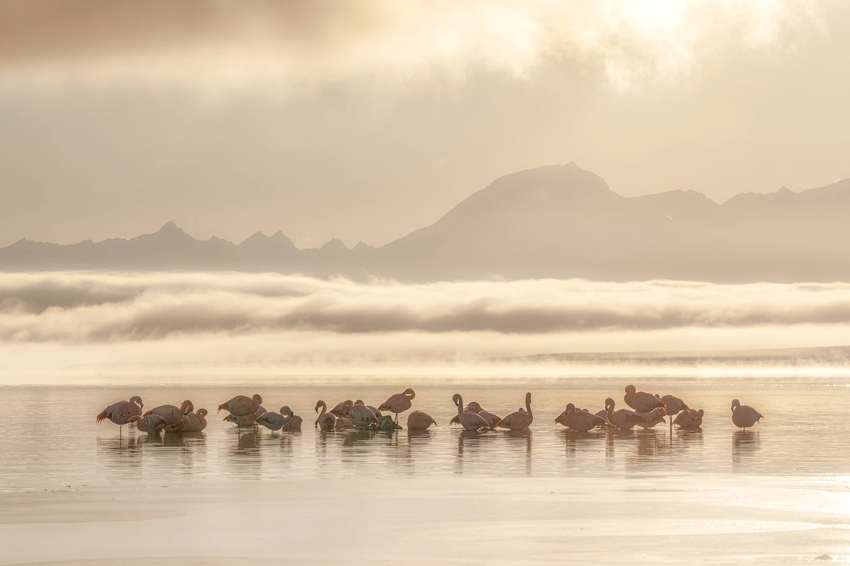 Παρά τις ελάχιστες ώρες ημέρας, το ηλιακό φως στην Παταγονία είναι εξαίσιο τον χειμώνα. Μετά την άφιξή μας στο Puerto Natales, η ομάδα μου περπάτησε κατά μήκος της παραλίας την ώρα που ο ήλιος άρχιζε να δύει και εντόπισε αυτά τα φλαμίνγκο που φωτίζονταν από πίσω. Πήρα τη μηχανή μου, και περπατήσαμε προσεκτικά ως την ακτή που ήταν καλυμμένη με χιόνι και πάγο. Μέσα στο παγερό κρύο, ξάπλωσα στο παγωμένο έδαφος για να τραβήξω φωτογραφίες. Το ζεστό ηλιακό φως, που τύλιγε τα πάντα, δημιούργησε μια μαγική ατμόσφαιρα.