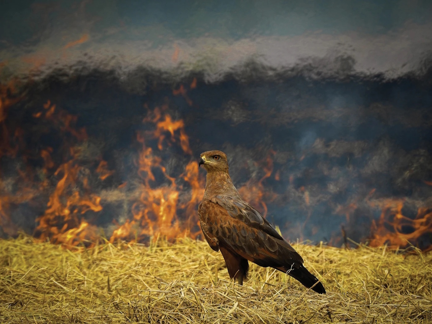 Καθώς παρατηρούσα τις φλόγες, πρόσεξα έναν γεράκι σαβάνας (Savanna Hawk). Προσηλωμένο και υπομονετικό, το πουλί δεν απομακρύνθηκε ποτέ από τον πυκνό καπνό και τη ζέστη· μάλιστα, επέστρεφε ξανά και ξανά ελπίζοντας να κυνηγήσει αποπροσανατολισμένα ζώα που εγκατέλειπαν τις φλόγες. Εγώ, από την άλλη, τελικά αναγκάστηκα να υποχωρήσω. Πριν φύγω, αποτύπωσα αυτή τη μαρτυρία σε εικόνα, ως έναν από τους πολλούς τρόπους με τους οποίους η άγρια φύση επιβιώνει και προσαρμόζεται απέναντι σε ακραίες περιβαλλοντικές συνθήκες.